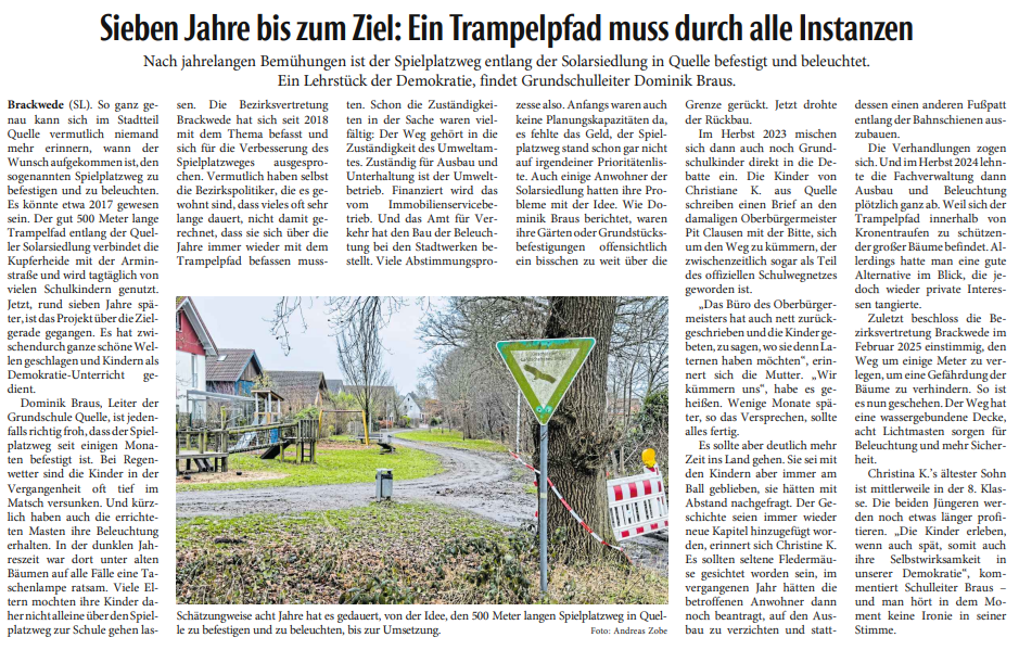 Gute Nachrichten für alle Kinder, die aus Richtung Kupferheide/ Berner Straße kommen: Der Fußweg hat eine neue Befestigung bekommen und wird im Dunkeln ab sofort beleuchtet.